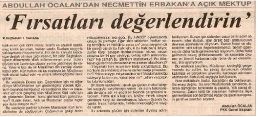 Ayrıca artık sübuta ermiş olduğu üzere Abdullah Öcalan’a belki de ilk mektup gönderen kişi Merhum Necmettin Erbakan olup, toplamda 3 mektup gönderdiği bilinmektedir. Bu mektupların içeriği tam bilinmese de TERÖRÜN SONLANDIRILMASINA ilişkin taleplerini ve demokratik çözüm isteklerini içerdiği bilinmektedir. Öcalan’ın kendisine yazdığı mektupların da varlığı bilinmekte olup, bir tanesi de açık mektup şeklinde basın yayını organlarında yer almıştır. Aracılar vasıtasıyla görüşmeler yaptığı da birçok kaynakta ifade edilmektedir. Merhum babanız tartışmasız bir vatansever olarak, Öcalan’la bu dolaylı görüşmeleri bir zaafiyet, acziyet ya da taviz anlayışıyla değil, ufku gören bir devlet adamı vizyonuyla ve Terörsüz Türkiye özlem ve kararlılığıyla gerçekleştirmişti.